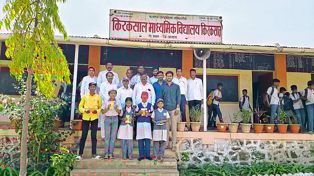 किरकसाल : रॉयल फ्रेंड्स ग्रुपच्या सदस्यांसह विद्यार्थी. (फिरोज तांबोळी : सकाळ छायाचित्रसेवा)