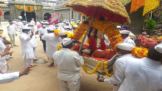 या अभंगावर त्यांनी निरुपण केले. विठ्ठल रुक्मिणी मंदिरात संत तुकाराम महाराजांच्या पादुकांची पूजा करण्यात आली. मानकरी म्हसलेकर दिंडी यांनी संबळ, टाळमृदंग गजर आणि तुताऱ्या वाद्यांसह मुख्य मंदिरातील भजनी मंडपात आली. दुपारी पावणेतीनच्या सुमारास पालखी प्रस्थान सोहळ्यास सुरुवात झाली. देऊळवाड्यातील भजनी मंडपात संत तुकाराम महाराज पादुका आणि माऊलींच्या पादुकांची विक्रम महाराज माळवे, खासदार श्रीरंग बारणे, आमदार सुनील शेळके यांच्या हस्ते महापूजा झाली. देहूतील पुजारी नारायण अत्रे यांनी पौराहित्य केले. संस्थानचे अध्यक्ष मधुकर महाराज मोरे, पालखी सोहळा प्रमुख माणिक महाराज मोरे, विशाल महाराज मोरे, संतोष महाराज मोरे, विश्वस्त अजित महाराज मोरे, काशिनाथ महाराज मोरे, संजय महाराज मोरे, संत ज्ञानेश्वर महाराज पालखी सोहळ्याचे प्रमुख विश्वस्त अॅड. विकास ढगे आदी उपस्थित होते.