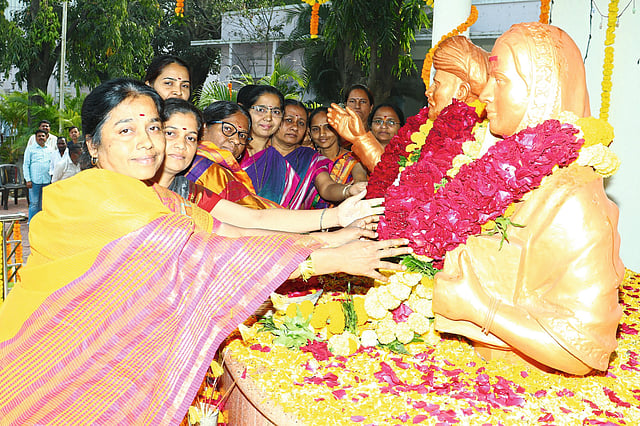 माळीनगर (ता. माळशिरस) : महात्मा फुले व सावित्रीबाई फुले यांच्या पुतळ्यास अभिवादन करताना महिला.