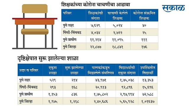 पिंपरी-चिंचवडमधील ५७.३३ टक्के, तर जिल्ह्याच्या ग्रामीण भागातील ७२.५० टक्के शाळा सुरू झाल्या आहेत. परंतु विद्यार्थ्यांची उपस्थिती तुलनेने कमी असल्याचे दिसून येत आहे. विद्यार्थ्यांना शाळेत उपस्थित राहण्यासाठी अनिवार्य असणाऱ्या पालकांच्या संमती पत्रांची संख्या लक्षणीय आहे. परंतु, जिल्ह्यात शाळेत प्रत्यक्ष हजेरी लावणाऱ्या विद्यार्थ्यांची टक्केवारी सात ते चोवीस दरम्यान आहे. पुणे शहरात ७.६ टक्के, पिंपरी-चिंचवडमध्ये १६.८९ टक्के, पुणे ग्रामीण २४.३५ टक्के, तर जिल्ह्यात १७.९५ टक्के विद्यार्थी सध्या शाळेमध्ये हजेरी लावत आहेत.