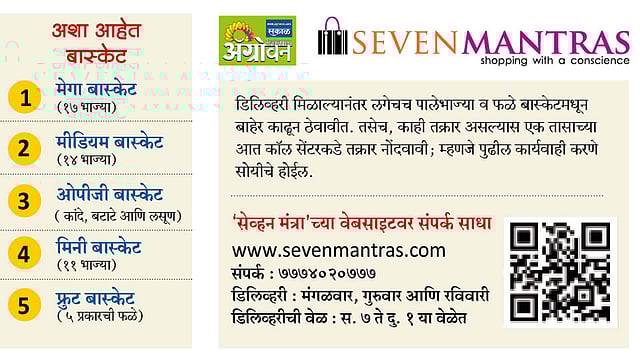 मसाला बास्केटमध्ये आलं, लसूण, हिरवी मिरची, लिंबू, पुदिना, ओल खोबरं, कोथिंबीर आणि कढीपत्ता आदींचा समावेश आहे. ही बास्केट २२५ रुपये किमतीत उपलब्ध करून देण्यात आली आहे. या बास्केटची तसेच इतर भाजीपाला आणि फळांच्या नोंदणीसाठी www.sevenmantras.com या वेबसाइटवर अगाऊ नोंदणी करता येणार आहे.