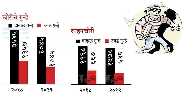 २०१८ या वर्षी चोरीच्या ३८ टक्के घटनांचे गुन्हे उघड करण्यात आले होते. त्या तुलनेत मागील वर्षी गुन्हे उघड करण्याचे प्रमाण कमी झाले. २०१९ मध्ये चोरीचे गुन्हे उघड करण्याचे प्रमाण ३४ टक्क्यांवर आले.