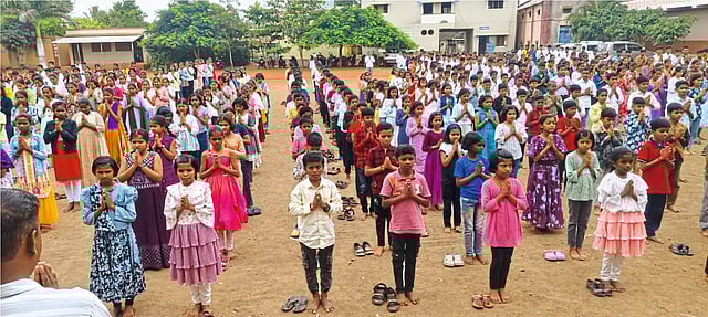 पारगाव, ता. १४ : पारगाव (ता. आंबेगाव) येथील संगमेश्वर माध्यमिक आणि कै. बाबुराव गेणूजी ढोबळे उच्च माध्यमिक कला, वाणिज्य व विज्ञान विद्यालय येथे गुरुवारी (ता. १४) सामुदायिक पसायदान म्हणण्यात आले. २०२५ हे वर्ष ज्ञानेश्वर महाराजांचे सप्तशतकोत्तर सुवर्णमहोत्सवी (७५०) जयंतीवर्ष आहे. त्यानिमित्त हा उपक्रम राबविण्यात आला.