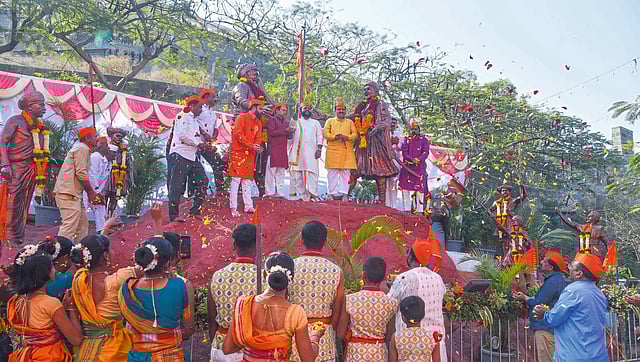 जेजुरी, ता. १९ : मार्तंड देवसंस्थानच्या वतीने छत्रपती शिवाजी महाराजांच्या जयंतीनिमित्त शहाजीराजे आणि छत्रपती शिवाजी महाराज यांच्या भेटीच्या समूह शिल्पाच्या ठिकाणी पुष्पवृष्टी करीत मानवंदना देण्यात आली. गडाच्या शेजारी पायरी मार्गावर देवसंस्थानच्यावतीने शहाजीराजे आणि छत्रपती शिवाजी महाराज यांच्या भेटीचे समूह शिल्प साकारले आहे. खंडोबा गडावर या दोघांची भेट झाली होती. या समूह शिल्पाजवळ विश्वस्त, भाविक, नागरिक आणि कलाकारांच्यावतीने पुष्पवृष्टी करण्यात आली.