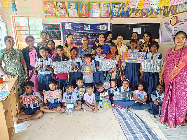 जेजुरी, ता. १६ : कुसुमवत्सल्य फाउंडेशन, पुणे व इनरव्हील क्लब ऑफ, पुणे विंग्ज यांच्या वतीने जेजुरी परिसरातील रेल्वे स्टेशन व रामोशीमळा (खोमणेवस्ती) येथील जिल्हा परिषद शाळेतील ६१ विद्यार्थ्यांना शैक्षणिक व खेळाचे साहित्य वाटप केले.