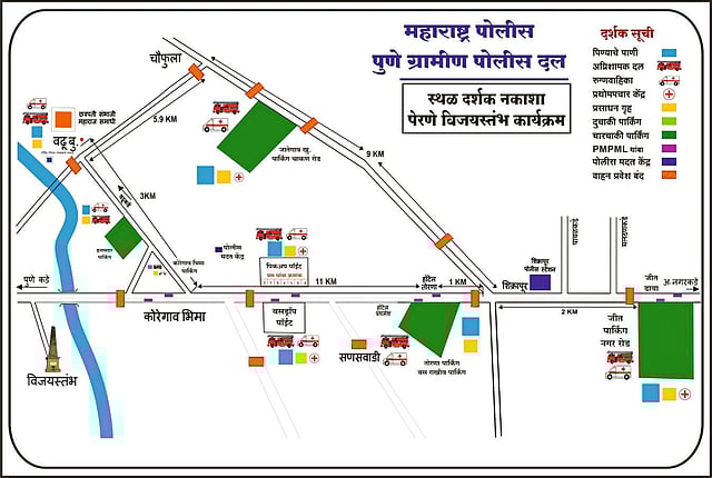 शिरूर व हवेली हद्दीत विविध टप्प्यावर सुमारे २२ ठिकाणी प्रशस्त पार्किंगची सोय करण्यात आली आहे तसेच अंतर्गत वाहतुकीसाठी बसेसचीही सुविधाही केली असून विजयस्तंभ परिसरात; मात्र पूर्णपणे वाहनबंदी करण्यात आली आहे.