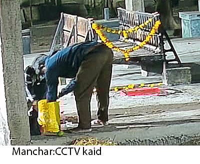 मंचर नगरपंचायतीने स्मशानभूमीत सीसीटीव्ही कॅमेरे बसवले आहेत. कॅमेऱ्यात सोमवारी रात्री १० ते रात्री ११ या वेळेत ३० ते ४० वयोगटातील दोघेजण संशयास्पद हालचाली करताना दिसले आहेत. त्यांनीच सांगाड्यावर पुष्पहार, लिंबू, टाचण्या आणि लाल कापड ठेवले असल्याचे कॅमेऱ्यात स्पष्टपणे दिसत आहे.