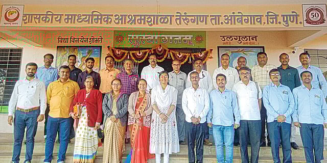 तेरुंगण (ता. आंबेगाव) ः येथील शासकीय आश्रमशाळेत उपस्थित अधिकारी व शिक्षक.