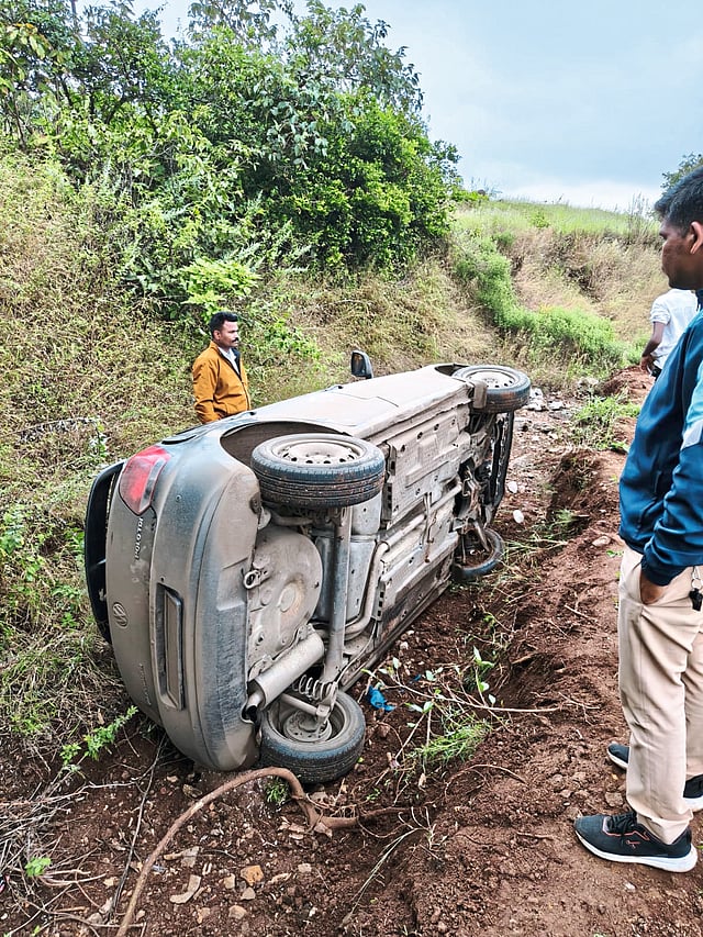 भीमाशंकर, ता. २ : भीमाशंकर येथून देवदर्शन करून मुंबईकडे परत जात असताना मंचर-भीमाशंकर रस्त्यावरील पोखरी घाटात कलमजामाता मंदिराजवळ वळणावर चारचाकी मोटार चालकाचा वाहनावरील ताबा सुटल्याने मोटार रस्त्याच्या कडेला असलेल्या खड्ड्यात पलटी होऊन अपघात घडल्याची घटना शनिवारी (ता. १) सायंकाळी घडली.