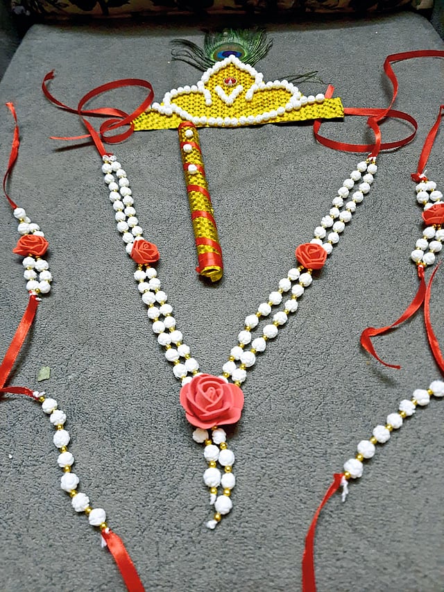 - विविध आकारातला हलवा तयार झाल्यावर जाडसर पुठ्ठ्यावर सोनेरी बेगड म्हणजेच चमकदार कागद चिकटवला जातो. मुकुट, बाजूबंद, कंबरपट्टा असे आकार कापून त्यावर हलवा दाण्यांनी सुंदर डिझाइन तयार केले जाते. परंतु हार, बिंदी, गजरा तयार करताना मुरमुऱ्यांचा लांब हलवा किंवा मोठा शेंगदाणा दोऱ्याच्या गाठीत अडकवला जातो. आकर्षक करण्यासाठी चंदेरी-सोनेरी स्प्रिंगप्रमाणे झिग दोऱ्यात ओवतात. अलीकडे कृत्रिम रंगीत फुलेदेखील हारासाठी वापरतात.