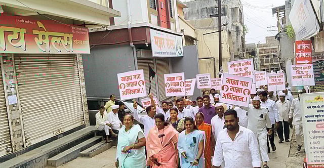 तळेगाव ढमढेरे, ता. १८ : तळेगाव ढमढेरे (ता. शिरूर) या ऐतिहासिक व एकसंध गावाची जिल्हा परिषद गट व पंचायत समिती प्रभाग रचनेत दोन गटांत विभागणी झाल्याने संतप्त ग्रामस्थांनी शुक्रवारी गाव बंदची हाक दिली होती. या वेळी पूर्वीप्रमाणे गट ठेवावा तसेच दोन गटांत झालेली प्रभागांची विभागणी रद्द करावी, या मागणीसाठी मोर्चा काढून निषेध व्यक्त करण्यात आला. हनुमान मंदिर ते मुख्य बाजारपेठ आणि ग्रामपंचायत कार्यालय असे मोर्चाचे स्वरूप होते. यामध्ये ‘माझा गाव, माझा अभिमान’, तळेगाव ढमढेरे जिल्हा परिषद गट कायम ठेवा, प्रभागाची केलेली विभागणी रद्द करा, आदी घोषणा देण्यात आल्या. तसेच, काळीफित बांधून निषेधाची फलके नागरिकांनी हाती घेतली होती.