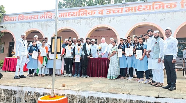 येथील विद्या विकास मंदिर विद्यालयातील प्रांगणात सामुदायिक कार्यक्रमांचे आयोजन केले होते. येथील ध्वजवंदन शिक्षण संस्थेचे अध्यक्ष माजी आमदार सूर्यकांत पलांडे व मान्यवरांच्या उपस्थितीत झाले. यावेळी विविध शाळांतील विद्यार्थ्यांनी सामुदायिक कवायत सादर करून ग्रामस्थांची मने जिंकली. माजी आमदार सूर्यकांत पलांडे व मान्यवरांच्या हस्ते गुणवंत विद्यार्थी व शिक्षकांचा सत्कार करण्यात आला.