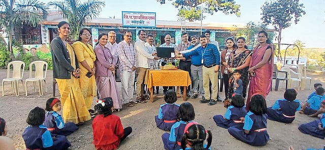 वाल्हे, ता. २० : मांडकी (ता. पुरंदर) येथील जिल्हा परिषद प्राथमिक शाळेला शुक्रवारी (ता. १९) जेजुरी औद्योगिक वसाहतीमधील बर्जर पेंट्स कंपनीच्या वतीने संगणक संच भेट देण्यात आला. या संगणक संचामुळे शाळेतील विद्यार्थी संगणक कौशल्ये आत्मसात करु शकतील व डिजिटल शिक्षणात त्यांना पुढे येण्याची संधी मिळेल, असे सांगण्यात आले. कंपनी व्यवस्थापक श्रीकांत सलात, नारायण शिनाळकर, श्रीकांत अरवत्तु, नुपूर, गगन वर्मा यांच्या हस्ते शाळेचे मुख्याध्यापक सुभाष बोरकर यांच्याकडे हा संच सुपुर्द करण्यात आला. या प्रसंगी सोमेश्वरचे माजी संचालक मोहन जगताप, शाळा व्यवस्थापन समितीचे अध्यक्ष गणेश जगताप, आसमा शेख, धनश्री जगताप आदी उपस्थित होते. मुख्याध्यापक सुभाष बोरकर यांनी प्रास्ताविक करताना विद्यार्थ्यांच्या शैक्षणिक प्रगतीसाठी डिजिटल साधनांचे महत्त्व अधोरेखित केले. हेमलता शेटे यांनी सूत्रसंचालन केले. तर, संजय जमदाडे यांनी बर्जर पेंट्स कंपनीचे या उपक्रमाबद्दल आभार मानले.