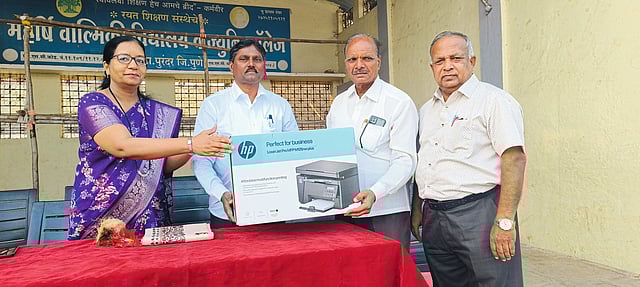 वाल्हे, ता. ३१ : ग्रामीण भागातील शाळांमध्ये शैक्षणिक व प्रशासकीय सुविधा सक्षम व्हाव्यात, या उद्देशाने मुंबईचे सहाय्यक पोलिस आयुक्त मयूर भुजबळ यांच्या वतीने वाल्हे (ता. पुरंदर) येथील रयत शिक्षण संस्थेच्या महर्षी वाल्मिकी विद्यालयास दोन प्रिंटर भेट देण्यात आले.