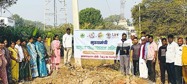 भोसे (ता. पंढरपूर) : येथील स्व. राजबाबू पाटील स्टेडियमवर मुख्यमंत्री समृद्ध पंचायतराज अभियानांतर्गत पाच हजार वृक्षांची लागवड करण्यात आली. यावेळी सरपंच ॲड. गणेश पाटील, ग्रामविकास अधिकारी डी. बी. भुजबळ, सुजाता वगरे, रेश्मा काशीद यांच्यासह ग्रामस्थ.