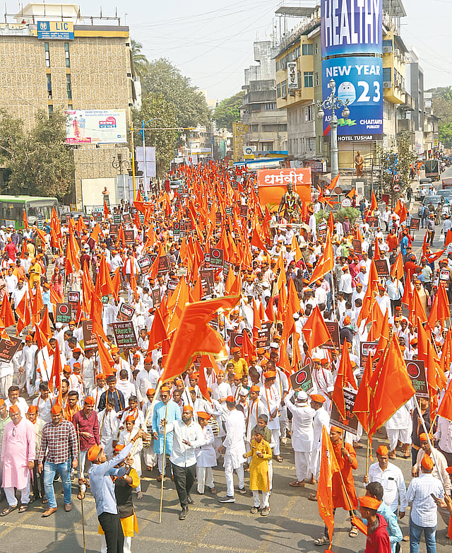 गो हत्या बंद करा, बेटी बचाव भारत बचाव, एकच वीर धर्मवीर, छत्रपती शिवाजी महाराज की जय, संभाजी महाराज की जय, जय श्रीराम आदी घोषणा मोर्चात देण्यात आल्या. मोर्चा पाहण्यासाठी रस्त्याच्या दुतर्फा नागरिकांनी मोठी गर्दी केली होती. या वेळी पोलिस बंदोबस्त कटेकोट होता.