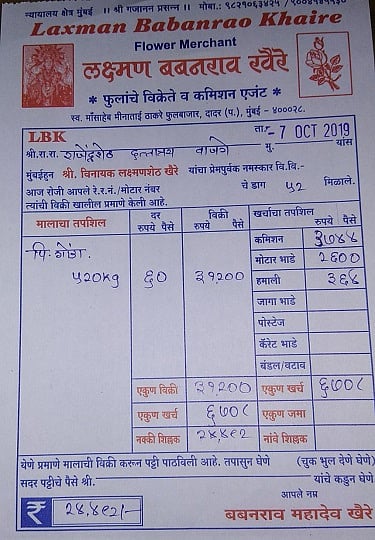 पाच ऑक्टोबर ते आठ ऑक्टोबरदरम्यान फुलांच्या बाजारभावात मोठी वाढ झाली. झेंडूच्या फुलांना प्रतिकिलो पन्नास ते साठ रुपये; तर शेवंतीच्या फुलांना रंगानुसार शंभर ते दीडशे रुपये भाव मिळाला. मात्र, पंधरा टक्के कमिशन, प्रती क्रेट पन्नास रुपये भाडे व सात रुपये हमाली, असा खर्च लावला. त्यामुळे दहा किलोच्या फुलांच्या एका क्रेटला एकशे तीस रुपये खर्च आला.