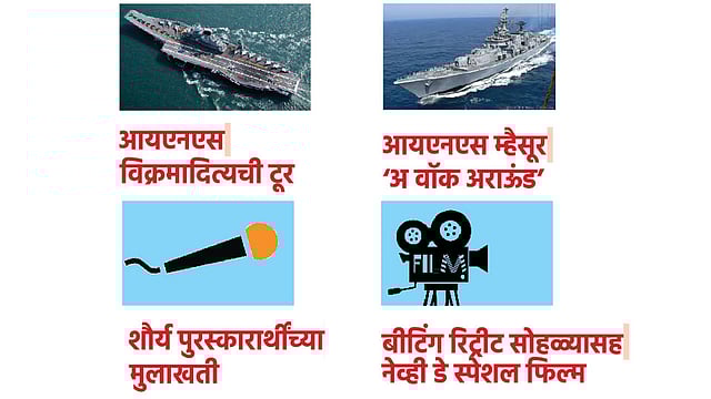 नौदलातील विनाशक ‘आयएनएस म्हैसूर’ही दर्शकांसाठी व्हर्च्युअली उपलब्ध आहे. दर्शकांना जहाजातील कर्मचाऱ्यांकडून संबंधित ब्रीफिंगसह जहाजाच्या प्रमुख ठिकाणांच्या आभासी प्रवासाची अनुभूती देणारा ‘अ वॉक अराऊंड’ हा कार्यक्रम होईल.