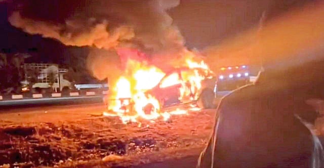 भिगवण, ता. १६ : पुणे-सोलापूर राष्ट्रीय महामार्गावर भादलवाडी (ता. इंदापूर) येथील बिल्ट कंपनीसमोर आज एका धावत्या व्होल्वो मोटारीने अचानक पेट घेतला. चालकाच्या प्रसंगावधानामुळे कोणतीही जीवितहानी झाली नाही, मात्र आगीत संपूर्ण कार जळून खाक झाली आहे.