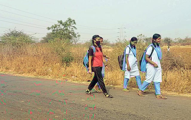वडाळा (ता. मोहोळ) : शाळा सुटल्यानंतर शिरापूरहून मोरवंचीकडेकडे चालत जाणाऱ्या विद्यार्थिनी.