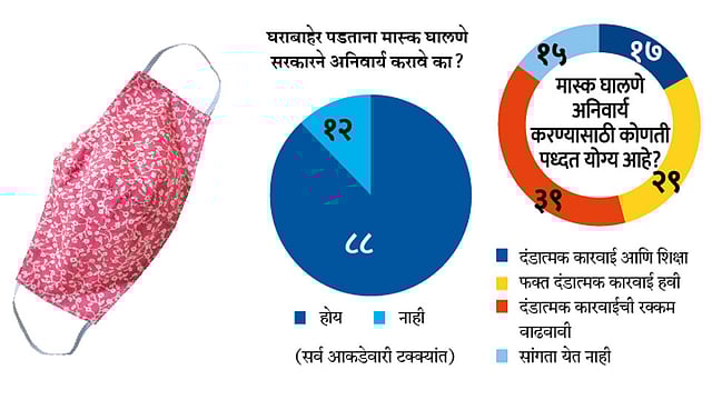 देशात आणि राज्यात कोरोनाबाधितांच्या संख्येत वाढ होत आहे. त्यामुळे काही राज्यांमध्ये मास्क घालणे हे अनिवार्य करण्यात आले आहे. त्या पार्श्वभूमीवर ‘लोकल सर्कल्स’च्या वतीने करण्यात आलेल्या एका सर्वेक्षणातून ही माहिती समोर आली आहे. कोरोनाचा संसर्ग रोखण्यासाठी मास्क न घालणाऱ्यांवर दंडात्मक कारवाई करावी, वेळ पडलीच तर दंडात वाढ करावी, असे उपाय नागरिकांनी सुचविले आहेत.