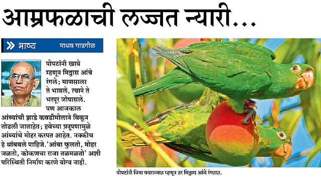 पण आंबा पाडाला आल्यावरच हे फलाहारी त्याच्यावर तुटून पडायला हवेत; आधी नकोत. बीज परिपक्व होण्याआधीच्या अवस्थेतल्या हिरव्या कैऱ्या हिरव्या पानांमध्ये सहज लपून जातात. आंबट कैऱ्यांमधून प्राण्यांना फारशी ऊर्जा मिळत नाही, उलट त्यांचा विषारी चीक बाधतो. मी आणि माझे ‘आंबटशौकीन’ मित्र लहानपणी कैऱ्या पाडून खायचो आणि आणि अनेकदा त्यांचा चीक उतल्याने ओठांवर, गालांवर फोड आलेले असायचे. म्हणून पोपट कैऱ्यांच्या वाटेला जात नाहीत. पाडाला आलेले पिवळट, केशरी, लालसर आंबे डोळ्यांत भरतात, त्यांचा चीक ओसरतो. आमराईचे मालक एखाद्या पोपटाने आंब्याला चोच मारण्याची वाट पाहत राहतात; मगच ते आंबे उतरवून पिकण्यासाठी अढीला घालतात; आणि आंबे पिकतात केव्हा? मुख्यतः पावसाळ्याच्या तोंडाला. त्याआधी बाठी कोरड्याठण्ण जमिनीत रुजल्या, तर ती रोपे सुकून जायचा धोका असतो. म्हणून आंब्याला मोहर येतो उरे घोटभर गोड हिवाळा अशा माघ- फाल्गुनाच्या महिन्यात आणि आंबे पाडाला येतात वैशाखात. अर्थात ते जितक्या लवकर बाजारात येतील तितके जास्त दराने विकता येतात, म्हणून मळेवाले खूप खटपटीने हे ऋतुचक्र बदलायचा प्रयत्न करतात.
