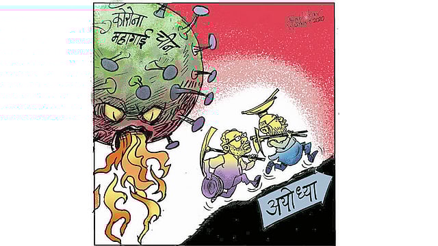 मोटाभाई : (रदबदली करत) मंदिरच्या भूमिपूजनमधी बध्दा लोगांना शरीक व्हायची इच्छा छे! आखिर काई झ्याला तरी, राष्ट्रना अहम मुद्दा छे!! कोरोना, चायना तो किरकोळ छे!! (जरासे खाकरुन) आपडो उधोजीभाईना मेसेज छे के एने पण अयोध्या आवानु छे!