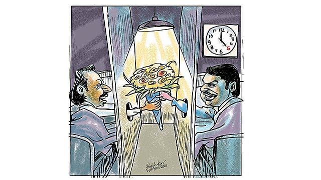 काळाचा महिमा कसा ते पहा, आपण दोघेही खरे तर एकत्र सत्तेत असणार होतो, पण आज मी (मास्क लावून) विरोधी पक्षनेता म्हणून हिंडतो आहे आणि तुम्ही मात्र (मास्क लावूनच) मंत्रालयात ऐटीत जात-येत आहा!! एकेकाळी आपण जोडीने शपथ घेतली होती, हे विसरलात तर नाही ना? दोघांनी एकदिलाने राज्य करावे, असा आपला कित्ती छान बेत होता, लेकिन ये हो न सका, और अब न रहे वो अरमान...जाऊ दे.