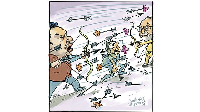 फडणवीसनाना : (गंभीर होत) भुजबळसाहेब, हे इथं भेटलो हे ठीक आहे, पण वारंवार असं भेटून आपण हास्यविनोद करणं महाराष्ट्राला परवडणारं नाही! लोक काय म्हणतील? यांचे दाखवायचे दात वेगळे आणि खायचे वेगळे!!