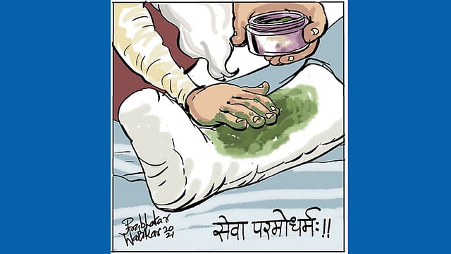 ममतादिदी : (खवळून) चूप कोरो!! माझा पाय खरोखर जायबंदी झालाय! डोकं दुखतंय! ताप आलाय! मला इस्पितळात यावं लागलं!! हे सगळं तुमच्यामुळे झालं! आजवर इतक्या निवडणुका लढवल्या, पण कधी असं झालं नव्हतं!! बघून घेईन!!
