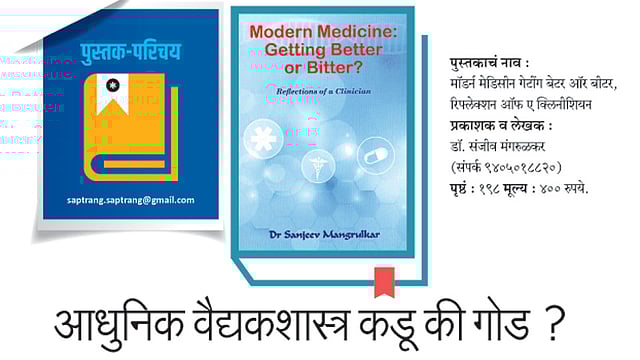 या काळजीपोटी जन्मते ते आपले प्रकृतीची काळजी, अनेक रोगांच्या शंका, बरीच औषधे आणि यातच आपण आपल्या एकंदर प्रकृतीचे नुकसान तर करून घेत नाही , औषधांच्या आहारी तर जात नाही , जीवनातील आनंद तर गमावत नाही ? हा सर्व विचार करायला लावणारे पुस्तक म्हणजे पुण्यातील दीनानाथ मंगेशकर हॉस्पिटलच्या वैद्यक शास्त्र विभागाचे माजी विभाग प्रमुख, मुख्य सल्लागार डॉक्टर संजीव मंगरूळकर यांचं “Modern Medicine Getting Better or Bitter? Reflections of a clinician” हे पुस्तक.