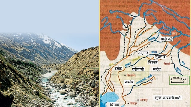 उपग्रह-प्रतिमांचा अभ्यास आणि प्रदेशाला देण्यात आलेल्या प्रत्यक्ष भेटींवरून, या भागातल्या सरस्वती नदीच्या परित्यक्त (Abandoned) प्रवाहाच्या अस्तित्वाचा अंदाज येऊ शकतो. रैनी आणि वहिंदा या नद्या सरस्वती नदीत समाविष्ट होण्यापूर्वीपासूनच अस्तित्वात असाव्यात आणि त्यांनी नदीखोऱ्यात भरपूर गाळसंचयन केलं असावं, असंही या अभ्यासातून सूचित होत आहे. पंजाब, हरियाना आणि उत्तर राजस्थानातून वाहत सरस्वती नदीचा प्रवाह खंबातच्या आखातात समुद्राला जाऊन मिळत असावा. राजस्थानमधे प्रवाह कोरडा होऊन पुढं हनुमानगड, पिलिबंगन, अनुपगडच्या दिशेनं जात असावा. भूशास्त्रज्ञांना या खोऱ्यातल्या प्रचंड गाळसंचयनाबद्दल आणि दरवर्षी १५ सेंटिमीटरपेक्षाही कमी पाऊस पडणाऱ्या थर वाळवंटाच्या पश्चिम भागात आढळणारी पाण्याची विपुलता याबद्दल नेहमीच उत्सुकता लागून राहिली आहे.