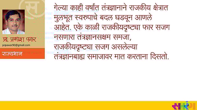 समकालीन दशकामध्ये व्यक्ती-व्यक्ती, व्यक्ती-समाज, व्यक्ती-राज्यसंस्था, व्यक्ती-अंतरराष्ट्रीय संस्था यांचे व्यवहार आणि त्यांचे संबंध यांच्यातले नातेसंबंधही तंत्रज्ञान याच घटकामुळं नव्याने रचत आणि घडत असल्याचं दिसतं. यामुळे तंत्रज्ञान अशी एक राजकीय संघटन करणारी राजकीय छत्री उदयास आलेली दिसते. तंत्रज्ञानबाह्य समाज त्या छत्रीखाली आला. तो "टेक्नोसॅव्ही' आहे; परंतु या दोन घटकांमध्ये मूलभूत अंतर दिसून येतं. 2014 च्या निवडणुकीमध्ये तंत्रज्ञानसक्षम आणि तंत्रज्ञानबाह्य या दोन समाजांमध्ये तीव्र राजकीय संघर्ष झाला. निवडणुकांखेरीज दैनंदिन राजकीय व्यवहार जवळपास तंत्रज्ञानानं घडवलेल्या मानसिकतेमध्ये घडतो. हा मुद्दा वेगवेगळ्या पद्धतींनी सध्या राजकारणावर प्रभाव टाकतो. त्यामुळे तंत्रज्ञानसक्षम समाजातल्या "टेक्नोक्रॅट' व्यक्तींना आणि गटांना आवाहन करून त्यांना कायमचं राजकारणात ओढून घेतलं जातं. त्यांना राजकीय कृती करण्यास उद्युक्त करण्याची राजकीय प्रक्रिया विविध राज्यांमध्ये घडताना दिसते. हा "टेक्नोक्रॅट' वर्ग राजकीय मानला जात नव्हता; परंतु त्यांच्यामध्ये राजकीय चर्चा घडवून आणल्या गेल्या. तंत्रज्ञान वापरणाऱ्या व्यक्ती आणि समूहांना त्यांचेत्यांचे हितसंबध आहेत. त्यामुळं एकूणच तंत्रज्ञानानं नव्यानं राजकीयीकरण केल्याचं आपल्याला दिसतं. या घडामोडी लक्षवेधक स्वरूपात दिल्ली, गुजरात, राजस्थान, महाराष्ट्र अशा विविध राज्यांत घडताहेत. या सर्व घटना संरचना आणि विचारप्रणाली अशा दोन्ही रूपांत अभिव्यक्त झाल्या आहेत. तंत्रज्ञानाच्या विचारप्रणालीचा पोत विकास, हिंदुत्व, सॉफ्ट हिंदुत्व असा आहे. त्या अंतर्गत घोषणा चित्तवेधक आहेत.