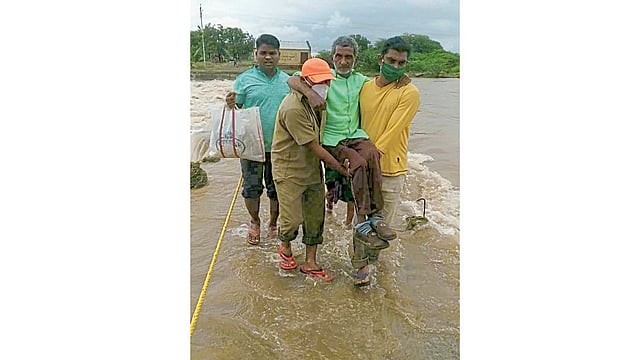 म्हसवड (जि. सातारा) : येथील पालिका आपत्ती व्यवस्थापनासाठी नेमलेल्या कर्मचाऱ्यांनी पुरामुळे अडकलेल्या नागरिकांना सुरक्षितपणे बाहेर काढले. परिसरात झालेल्या अतिवृष्टीमुळे माण नदीच्या पात्राकडेस अडकलेल्या लोकांना खांद्यावर घेऊन पैलतीरावर पोचवण्याचे जोखमीचे काम सागर सरतापे व त्यांच्या समवेत असलेल्या कोरोना योद्धा टीमने केले.
