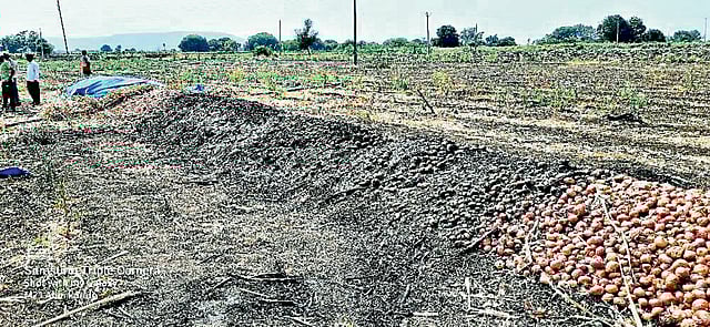 येथील रामकाठी शिवारात राजेंद्र करळे यांची दोन एकर कांदा पिकाची ऐरण होती. या शिवारात अनेक खांब झुकलेल्या अवस्थेत असल्याने विजेच्या बऱ्याच तारा खालून गेल्याने अक्षरशः या तारा लोंबकळत आहेत. परिणामी वारा आला, तरी या तारा हेलकावे घेत एकमेकांना चिकटून या परिसरात ठिणग्या पडत असतात. या ठिणग्या पडून मोठी दुर्घटना घडू शकते, याबाबत महावितरणकडे तक्रार करूनही महावितरणचे अधिकारी व कर्मचाऱ्यांनी याकडे गांभीर्याने पाहिले नसल्याचे राजेंद्र करळे यांनी सांगितले.
