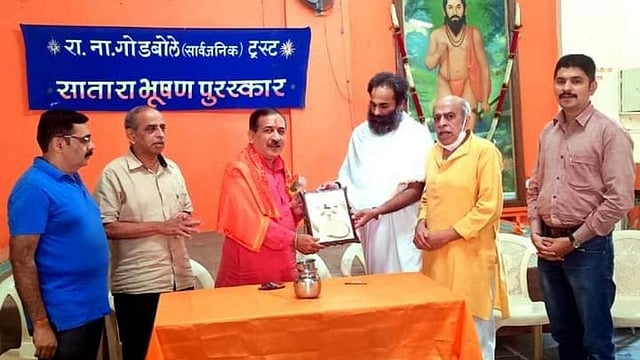 जगातील अनेक देशांतून सांप्रदायिक कीर्तनाची परंपरा जोपासत प्रबोधन करणाऱ्या चारुदत्त आफळे यांना सन 2020 चा रा. ना. गोडबोले सार्वजनिक ट्रस्टच्या वतीने दिला जाणारा सातारा भूषण पुरस्कार समर्थ सेवा मंडळाचे कार्यवाह योगेशबुवा रामदासी यांच्या हस्ते समर्थ सदनात झालेल्या कार्यक्रमात प्रदान करण्यात आला. त्यावेळी ते बोलत होते. समारंभास ट्रस्टचे विश्वस्त कर सल्लागार अरुण गोडबोले, माजी नगराध्यक्ष डॉ. अच्युत गोडबोले, विश्वस्त उदयन गोडबोले, प्रद्युम्न गोडबोले उपस्थित होते.