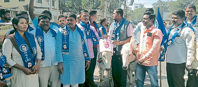 याच अनुषंगाने रिपाइं (ए) चे राज्य उपाध्यक्ष दादासाहेब ओव्हाळ यांच्या नेतृत्वाखाली जिल्हाधिकारी कार्यालयावर गाढव मोर्चा काढण्यात आला. गाढवाला चंद्रकांत पाटील यांच्या प्रतिमेचा मुखवटा घालत काढलेल्या मोर्चात जोरदार घोषणाबाजी करण्यात आली. मोर्चात कैलास जोगदंड, पूजा बनसोडे, सोमनाथ धोत्रे, राजेंद्र होटकर यांच्यासह इतर पदाधिकारी, कार्यकर्ते सहभागी झाले होते. दादासाहेब ओव्हाळ यांनी या वेळी चंद्रकांत पाटील यांचा निषेध करत भाजपवर टीका केली. मोर्चेकऱ्यांच्या वतीने जिल्हाधिकारी कार्यालयास निवेदन देण्यात आले आहे.