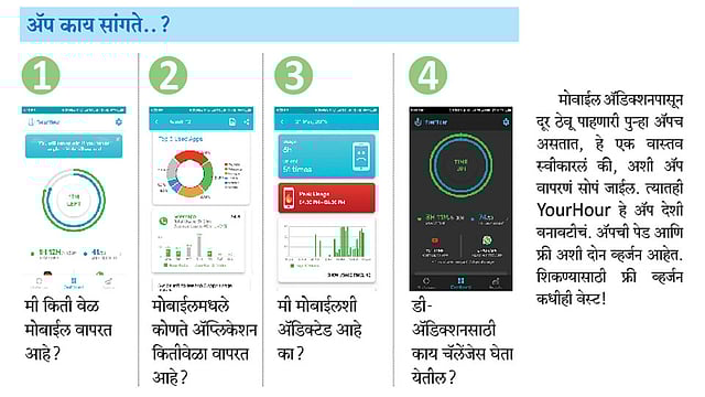 मैत्रीण पुन्हा मोबाईलकडंच पाहात विचार करू लागली. मोबाईलवरच शोधू लागली आणि तिला मिळालं नवं ॲप. ते डाऊनलोड केल्यानंतर मिळालेले रिझल्ट भन्नाट होते. मैत्रीण दिवसातून सव्वातीन तास मोबाईलवर आहे, असं ॲपनं सांगितलं. मग, ती वळली इतरांच्या मोबाईल वापराकडं. तिचा सहकारी, जो तिला सतत याचा विषयावरून डिवचायचा, त्याचा मोबाईल वापर निघाला पाच तास...! मैत्रीणीचा हा अनुभव बाजूला ठेवू. आपण मोबाईलशी ॲडिक्ट आहोत का, हे शोधण्याचा सोपा पर्याय म्हणजे YourHour ॲप. गेले वर्षभर ॲप वापरल्यानंतरचे निष्कर्ष भन्नाट आहेत.