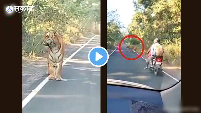 व्हायरल होत असलेल्या व्हिडिओमध्ये एक चारचाकी थांबली असून त्यातील एक व्यक्ती व्हिडिओ शूट करत आहे. तर जंगलातील रस्त्यावर पुढे एक वाघोबा थांबलेला आपल्याला दिसतोय. एक दुचाकीस्वार पुढे वाघ असतानाही समोर येतो आणि वाघ अचानक गाडीकडे येऊ लागतो. तेवढ्यात दुचाकीस्वार गाडी पाठीमागे घेत निघून जाताना या व्हिडिओत दिसत आहे.