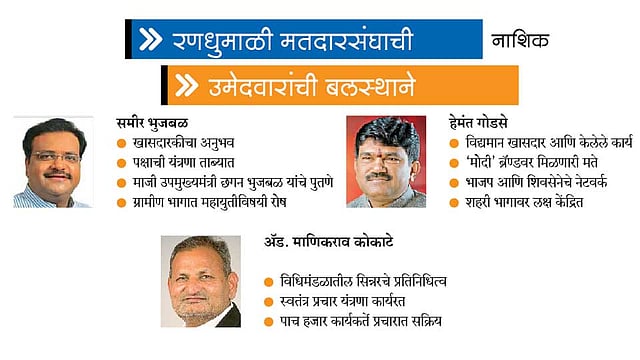 माजी उपमुख्यमंत्री छगन भुजबळ यांच्यासाठी पुतण्या समीर यांना निवडून आणणे महत्त्वाचे आहे. त्यामुळे राज्यातील प्रचाराची धुरा सांभाळताना नाशिकमध्येही घरोघरी जाऊन भुजबळ भेटी घेत आहेत. ग्रामीण भागात समीर, तर शहरी भागात स्वतः भुजबळ प्रचारात आहेत. गेल्या निवडणुकीत शेवटच्या टप्प्यात ‘जात’ फॅक्टर महत्त्वाचा ठरला होता. मात्र यंदा तशी स्थिती दिसत नाही.