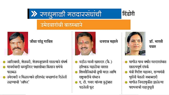 आदिवासींसाठी राखीव दिंडोरी (जि. नाशिक) मतदारसंघात शिवसेनेतून आलेल्या धनराज महालेंना राष्ट्रवादीने, तर राष्ट्रवादीतून आलेल्या डॉ. भारती पवारांना भाजपने उमेदवारी दिली आहे. उमेदवारांच्या अदल-बदलाने कार्यकर्त्यांमध्ये गोंधळ आहे. अशाही स्थितीत आपापल्या शक्तिस्थळांच्या जोरावर चुरस वाढविण्यासाठी धडपडणाऱ्या या दोन उमेदवारांसमोर मार्क्सवादी कम्युनिस्ट पक्षाचे उमेदवार आमदार जीवा पांडू गावितांच्या उमेदवारीने कडवे आव्हान उभे केलेय.