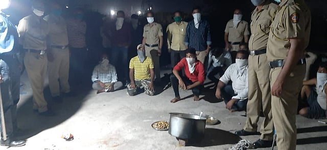 सहाय्यक पोलिस अधीक्षक डॉ.निलाभ रोहन यांना मिळालेल्या गुप्त माहिती नुसार एमआयडीसीतील एम सेक्टर-72च्या एका कंपनीच्या गच्चीवर पार्टि सुरु असल्याची खात्री करण्यासाठी उपनिरीक्षक अमोल मोरे, संदिप पाटिल, सहाय्यक निरीक्षक अतुल वंजारी, आनंदसिंग पाटील, रामकृष्ण पाटील यांच्यासह पोलिस पथक धडकले. एम सेक्टरच्या लिप केअर कंपनीच्या बाहेर अनेक दुचाकी उभ्या होत्या आत गेल्यावर कंपनीच्या गच्चीवर थेट पंगत बसलेली होती. जेवणावळीची पार्टी रंगात असतांनाच पोलिसांनी संशयीतांना पोलिस ठाण्याचे निवते देत, ताब्यात घेतले.