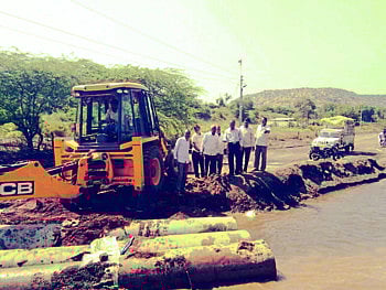 नदीत पाणी असल्याने वाहणे चालविणे अवघड होत आहे. बुधवारी (ता.२८) सकाळी नाशिककडे जाणारी बस उलटण्याची भीती व्यक्त होत होती. रस्त्याअभावी बससेवा बंद होऊ नये, म्हणून येथील रहिवासी तथा राज्य परिवहन महामंडळाचे जळगावचे विभाग नियंत्रक राजेंद्र देवरे व श्री स्वामी समर्थ पेट्रोलपंपाच्या संचालिका शैलेजा देवरे यांनी पदरमोड करत जेसीबीने सिमेंटचे सहा पाइप टाकून रस्ता दुरुस्त केला.