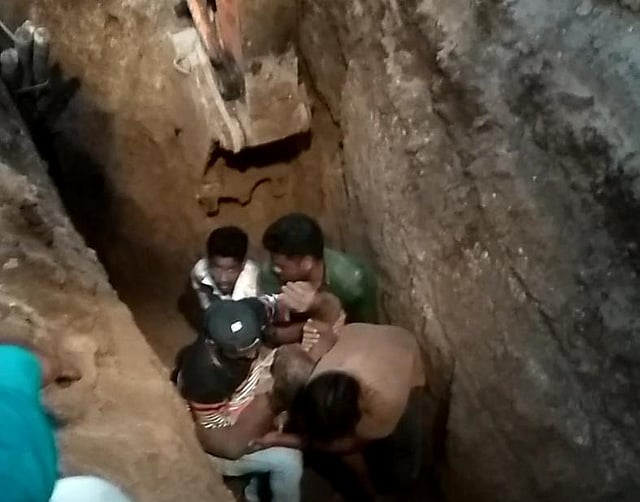 अमळनेर ः शहरातील हरिओमनगर भागात भुयारी गटारीचे काम सुरु आहे. सायंकाळी पाचच्या सुमारास खोल असलेल्या चेंबरमध्ये पाईप जोडणीचे काम करत असताना अचानक माती खचून कामगार मानेपर्यंत दबला गेला. हालचालही करता येईना; पण दोन- अडीच तासाच्या प्रयत्नानंतर त्या कामगारास सुखरूप बाहेर काढण्यात यश आले.