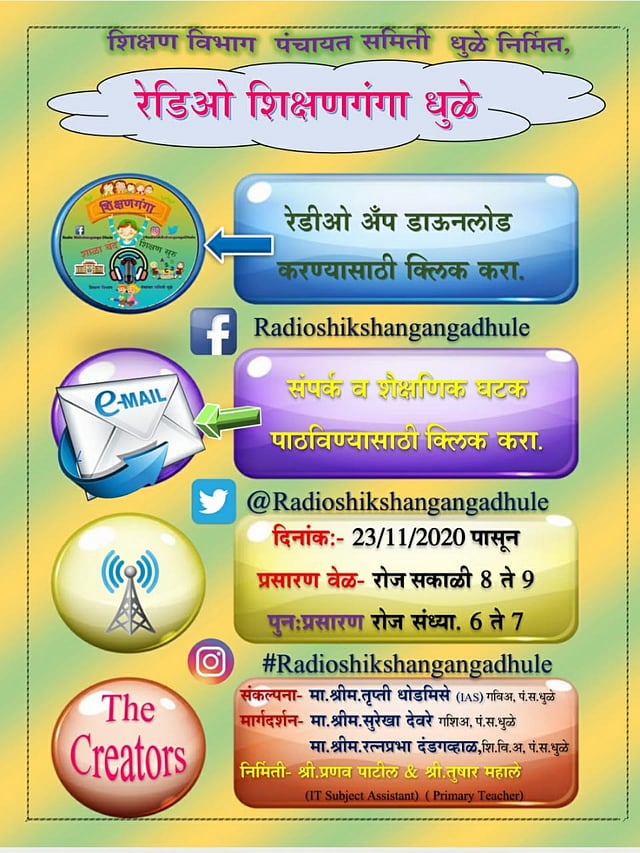 धुळे पंचायत समितीच्या गटविकास अधिकारी तृप्ती धोंडमिसे यांच्या संकल्पनेतून व गटशिक्षणाधिकारी सुरेखा देवरे, शिक्षण विस्तार अधिकारी रत्नप्रभा दंडगव्हाळ यांच्या मार्गदर्शनाने हा उपक्रम सुरू होत आहे. विद्यार्थी व पाल्य यांचे शिक्षण अविरत आनंददायी राहावे. अधिकाधिक विद्यार्थ्यांपर्यंत पोहोचावे. यासाठी https://bit.ly/3f9ZNX7 रेडिओ लिंकअॅपवर डाऊनलोड करता येणार आहे. लवकरच ॲप गूगल प्ले स्टोअरवर उपलब्ध करून देण्यात येईल.