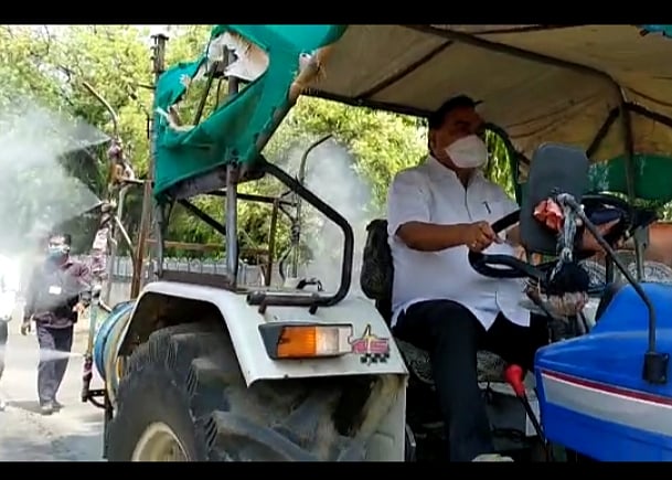 ट्रॅक्टरद्वारे केली फवारणी