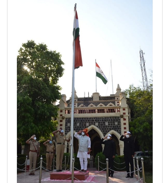 जळगाव ः महाराष्ट्र दिनानिमित्त जळगाव जिल्हाधिकारी कार्यालयात आज सकाळी आठला जिल्ह्याचे पालकमंत्री गुलाबराव पाटील यांच्या हस्ते ध्वजारोहण करण्यात आले. कोरोना व्हायरसच्या पार्श्वभूमीवर यंदा प्रथमच महाराष्ट्र दिनाचा ध्वजारोहण समारोह फक्त वरिष्ठ अधिकाऱ्यांच्या उपस्थितीत पार पडला.