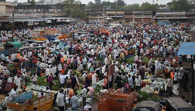 जळगाव: संचारबंदीच्या काळात अत्यावश्यक सेवा म्हणून भाजीपाला व्यवसाय देखील वगळण्यात आला आहे. कृषी उत्पन्न बाजार समितीमध्ये सोशल डिंस्टटला ढेंगा दाखवत लिलावात भाजीपाला खरेदी करण्यासाठी विक्रेत्यांसह नागरिकांची मोठ्या प्रमाणात गर्दी केली होती. बाजार समितीमध्ये होणारी गर्दीमुळे नागरिकांसह विक्रेत्यांकडून स ंचारबंदीच्या आदेशांना केराची टोपली दाखविली जात असल्याचे चित्र आज दिसून आले.