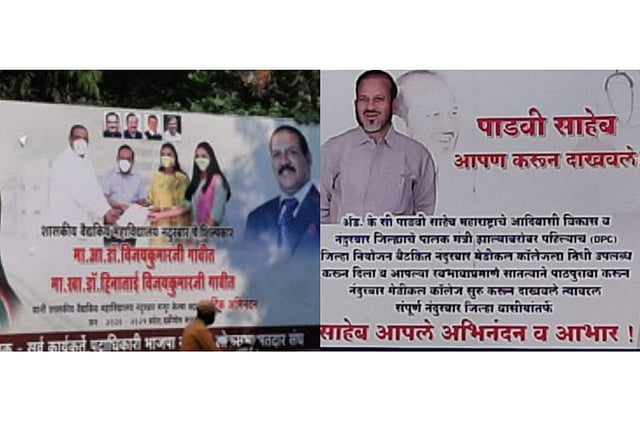 पालकमंत्री ॲड. के. सी. पाडवी यांनी मेडिकल कॉलेजसाठी डीपीडीसीमधून तीन कोटींचा निधी मंजूर केला आहे. त्यांपैकी दीड कोटी वितरित झाला आहे. राज्यात महाविकास आघाडीचे शासन आहे. आरोग्यमंत्री काँग्रेसचे आहेत. त्यामुळे केंद्र शासनाला लागणारी हमी व राज्य शासनाचा ४० टक्के हिस्सा मंजुरीचा प्रस्ताव त्यांच्यामार्फत बजेटमध्ये जाणार आहे. त्यामुळे पालकमंत्री, आरोग्यमंत्री कॉंग्रेसचे असल्याने प्रवेश मंजुरीचा दावा त्यांचे कार्यकर्ते करीत आहेत. त्यामुळे कॉंग्रेसचे नेते व पालकमंत्री ॲड. पाडवी यांच्या कार्यकर्त्यांनी बॅनर झळकविले. त्यानंतर आमदार डॉ. विजयकुमार गावित, खासदार डॉ. हीना गावित यांच्या कार्यकर्त्यांनीही चौकात बॅनर लावले. त्यामुळे श्रेयाचे बॅनर वॉर सध्या सुरू आहे.