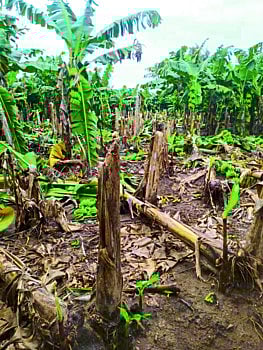 गेल्या आठवड्यात तीन-चार दिवस वादळ वाऱ्यासह रोज पाऊस पडत असून, पिकांचे नुकसान झाले आहे. याअगोदर मूग, उडीद हातचा गेला आहे. आता कापूस व ऊस आडवा झाला आहे. त्याचबरोबर बहरात असलेले केळी पीकही उद्ध्वस्त झाल्याने शेतकरी हतबल झाला आहे. नुकसानीचे पंचनामे करून तत्काळ नुकसानभरपाई द्यावी, अशी मागणी केळी उत्पादक शेतकऱ्यांनी केली आहे.